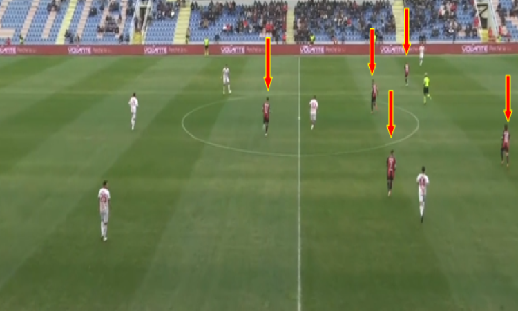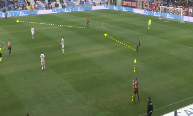 L’assetto offensivo strutturato con un 3+1, è composto da Chiricò (giocatore chiave), D’Ursi (ex giallorosso) e Tribuzzi (giocatore di categoria superiore). Due le punte che variano: Gomez o Cernigoi. Nella sottostante slide mostriamo una collocazione in fase di non possesso del reparto di attacco del Crotone dislocato con un 4+1.