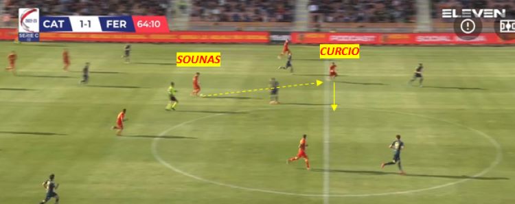Ghion conduce palla scaricando a Sounas che troverà nello spazio Curcio tra due giocatori della Feralpisalò