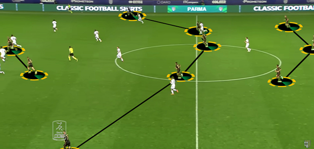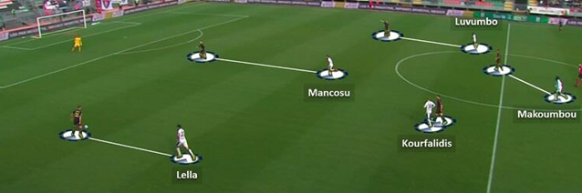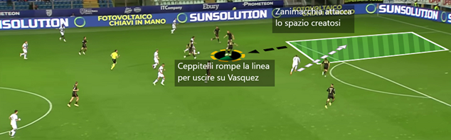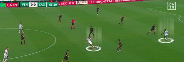 Come si comportano i due esterni di centrocampo? Hanno un ruolo prevalentemente difensivo o offensivo? Si tratta più di un 5-3-2 camuffato o di un 3-3-4 a trazione anteriore. Nel caso del Venezia, sia Candela sulla destra che specialmente Zampano sulla sinistra hanno un’interpretazione del ruolo particolarmente offensiva che li porta ad accompagnare tanto l’azione a costo di lasciare parte di campo dietro. Questo permette poi di lanciare in contropiede gli avversari di turno dove trovano spazi aperti sulle corsie laterali.