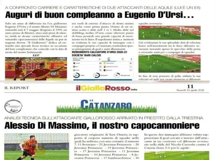 Alessio Di Massimo e Eugenio D'Ursi, i due bomber legati anche da una curiosa coincidenza: essere stati i migliori del Catanzaro, nella stagione attuale il nostro Alessio, nella stagione 2018/19 Eugenio. La Redazione de "Il Giallorosso" dedica in occasione del loro compleanno uno speciale quanto originale focus a cura del proprio match analyst Niccolò Brancati, curiosità e caratteristiche a confronto. E quest'anno al termine della stagione regolare, a vincere la sfida a distanza è stato il nostro attuale bomber, Di Massimo, neanche a dirlo, per un sol gol di distacco: 9-8! Siamo sicuri che dopo i play off il divario sarà più consistente...!!