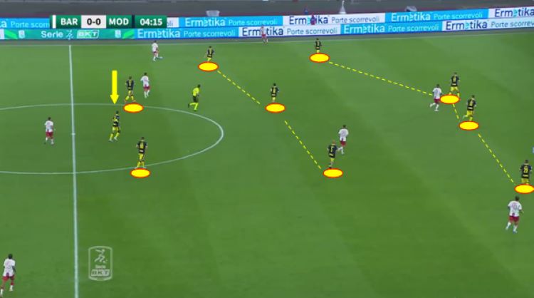 Mister Paolo Bianco è uno dei tanti discendenti dalla scuola di mister De Zerbi “è stato suo vice al Sassuolo”. Abbiamo potuto notare come molte delle volte viene attribuita la costruzione dal basso associato al possesso di palla. Nell’immagine sottostante segnaliamo una costante della fase del possesso che è quella del portiere uomo di movimento aggiunto al reparto di difesa. Andrea Seculin è un portiere esperto per la categoria visto il suo passato nella serie maggiore con le maglie di Chievo Verona, Fiorentina e Sampdoria. I suoi punti di forza sono: passaggi lunghi che permettono di alzare il baricentro nei confronti della squadra avversaria e parate e tiri dalla lunga distanza. Debole nelle uscite sui cross e nella concentrazione.