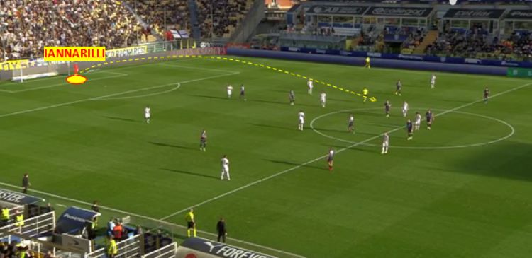 Quando costruisce dal basso la Ternana si schiera 3+1. Il vertice basso (Amatucci – CC) viene supportato dalla difesa schierata: Diakitè (DCD) Capuano (DC) e Lucchesi (DCS). Da notare anche come in zona di costruzione si verifichi la presenza di un rombo con i due braccetti che si abbassano lasciando basso solo il portatore di palla centrale (Capuano - DC).