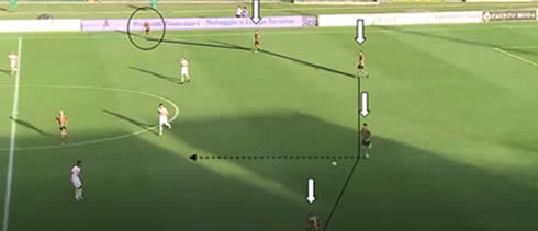 Da riscattare il pesante 5-1 del “Liberati” dove la Ternana è scesa sul terreno di gioco con una dislocazione difensiva composta da 4 unità + 1 quinta rappresentata in questa occasione da un cerchio. Nell’immagine sottostante notiamo come uno dei due (DC) in questo caso quello di sinistra, imposta la ripartenza per la squadra umbra con palla al piede provando la giocata verso l’ampiezza o in un eventuale profondità in cerca delle due punte di gioco.