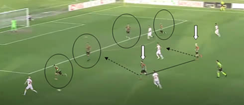 In fase di finalizzazione, la giocata spesso avviene dalla zona laterale dell’area di rigore della squadra in questo caso giallorossa, dove una giocata in 1 vs 1 (rappresentata nel cerchio), permette l’inserimento di +2 uomini rosso-verdi all’interno dell’area di rigore già composta da 3 pedine giallorosse in fase di marcatura sugli attaccanti della squadra avversaria (rappresentati con le due freccette).