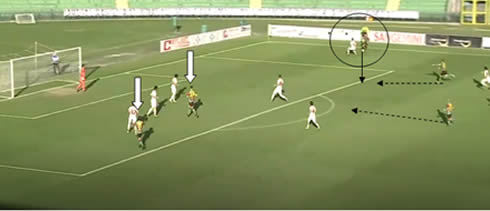 In fase di finalizzazione, la squadra rosso-verde si presenta attraverso una giocata in contropiede sulla corsia di destra. In questa immagine osserviamo come il numero 21 Partipilo in conduzione di palla al piede si proietta verso la zona di finalizzazione, cosi da provare la giocata centrale per una delle due punte di attacco (cerchiate).