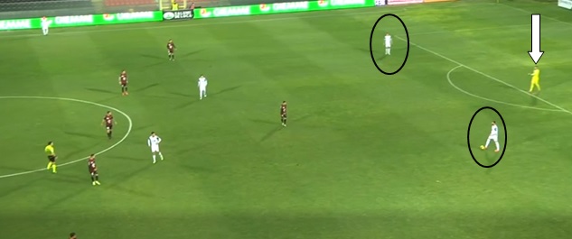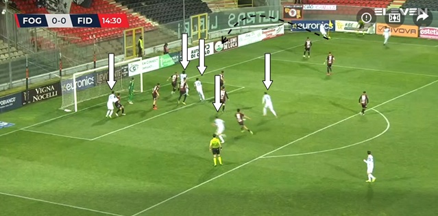 PALLE INATTIVE A FAVORE: Nella seconda palla inattiva troviamo un calcio d’angolo a Favore dove vede 5 uomini in casacca bianca all’interno dell’area di rigore del Foggia. La battuta dal corner avvenuta dal centrocampista Gaeta si concluderà con un colpo di testa da parte del difensore Legittimo sopra la traversa: