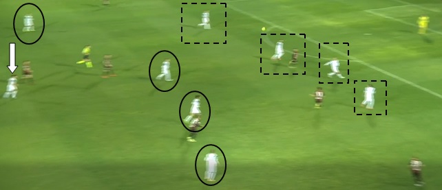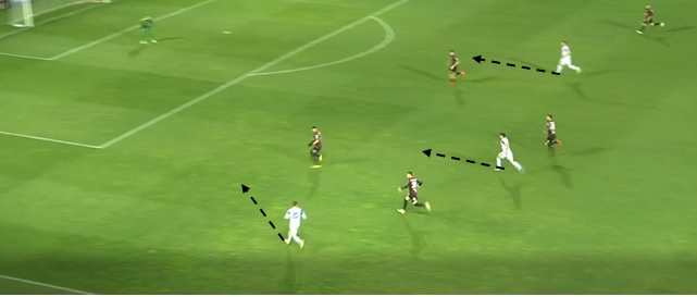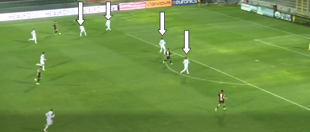 FASE DI NON POSSESSO DI PALLA: In questa fase di gioco, i pugliesi tendono molto ad abbassarsi portando un complessivo di 7 giocatori tra difensori e centrocampisti nella propria metà di campo. Con le 4 frecce rappresentiamo i difensori che molto probabilmente gli attaccanti delle Aquile affronteranno (Monterisi, Riggio, Legittimo, Carullo). Secondo i dati statistici raccolti dalla nostra redazione, il reparto difensivo dei pugliesi nell’anno 2021 ha raccolto un numero di goal pari a 32 contro i 3 subiti nel 2022: