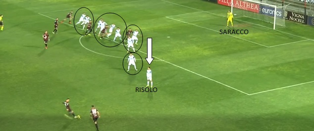 PALLE INATTIVE A SFAVORE: Concludiamo la nostra analisi con il focus sulle palle inattive a Sfavore e Favore. Nella prima immagine osserviamo un calcio di punizione a Sfavore, dove l’estremo difensore Saracco posiziona un solo uomo in barriera (RISOLO). Dislocazione a linea con uno stile di marcatura ad uomo 1vs1 sui giocatori del Foggia: