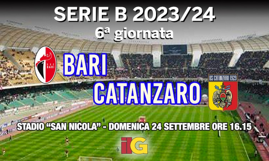 Sesta giornata di Serie B, il Bari di Mignani e De Laurentis jr. ospiterà al "San Nicola" il Catanzaro reduce dalla pesante sconfitta casalinga contro il Parma. Il Catanzaro in cerca di pronto riscatto, mister Vivarini ha cercato, in settimana, non solo di lavorare sull’aspetto tattico, ma anche sotto il profilo mentale, per rimettere a posto i cocci della dolorosa sconfitta. Il Bari in caso di vittoria aggancerebbe proprio le Aquile a 10 punti: un Bari che ama pareggiare in questo campionato, i suoi sette punti sono infatti frutto di 4 pareggi (ultimo contro il Pisa) e una vittoria, mentre i giallorossi sembrano avere caratteristiche opposte, solo un pareggio finora nella prima di campionato contro la Cremonese dell'esonerato Ballardini, poi tre vittorie e una sconfittta. Gara aperta a qualunque risultato, saranno probabilmente gli episodi a determinare il finale di una sfida tra passato e presente, tra le squadre vincitrici dei due ultimi campionati di lega pro girone C. Il match è emblematico del nobile passato delle due compagini.
